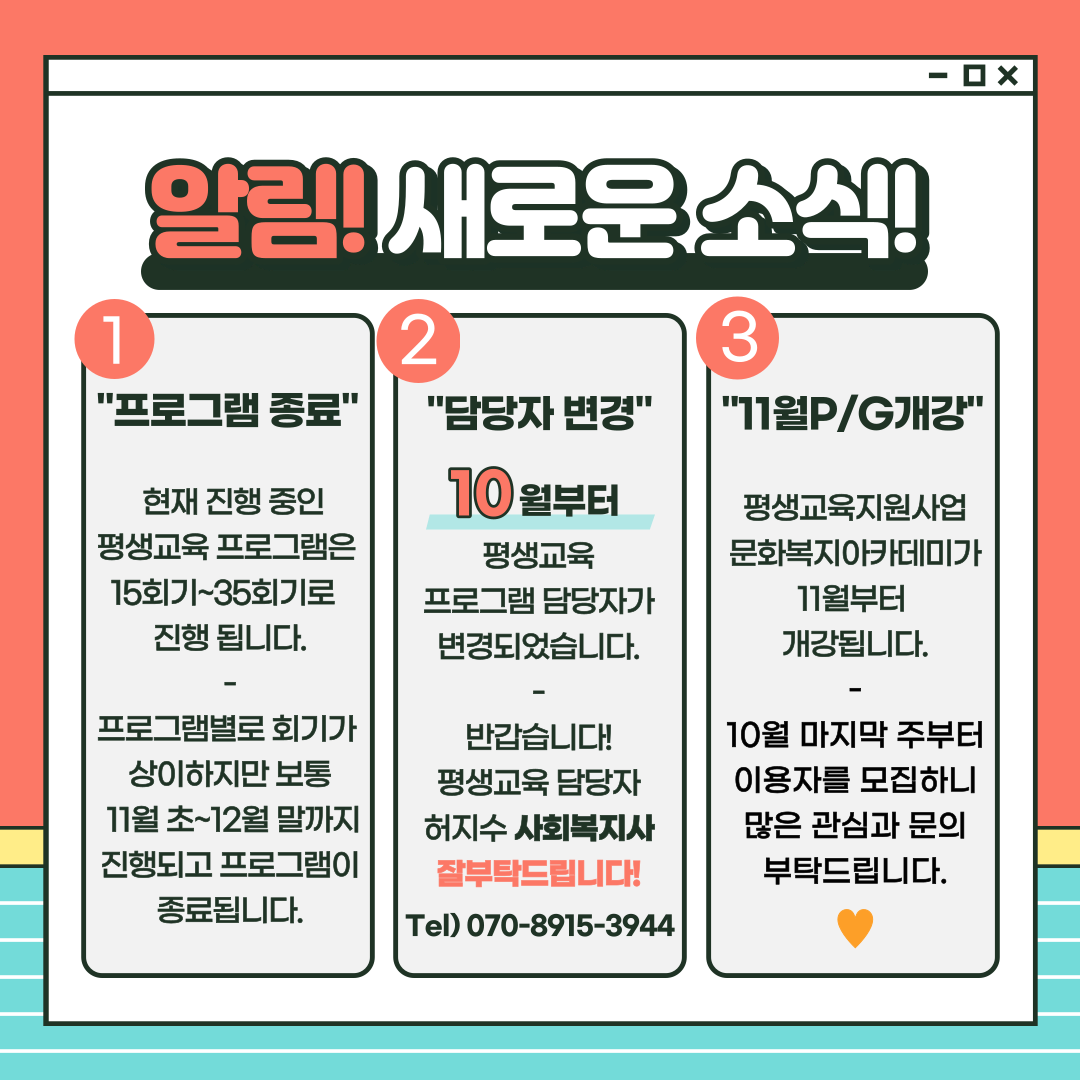 안녕하세요! 10월부터 평생교육 담당을 맡게 된 허지수 사회복지사 입니다!