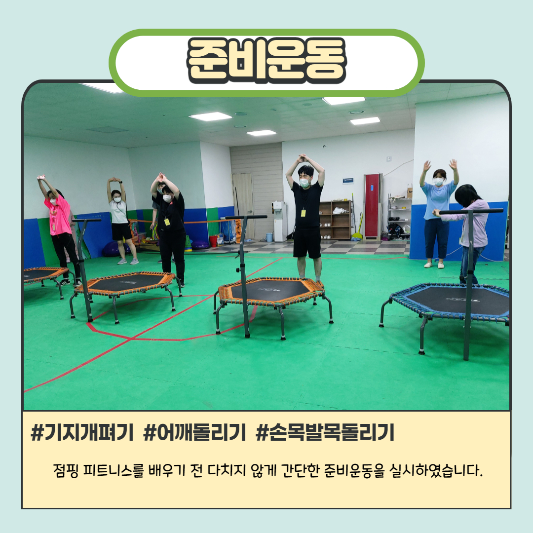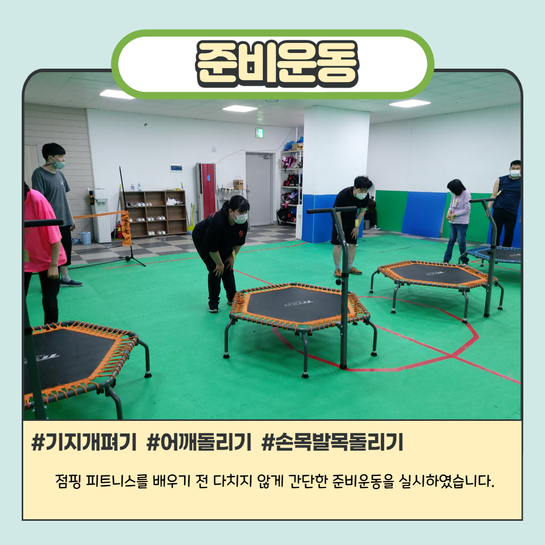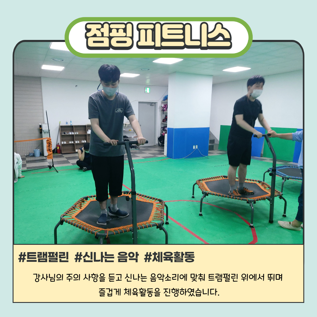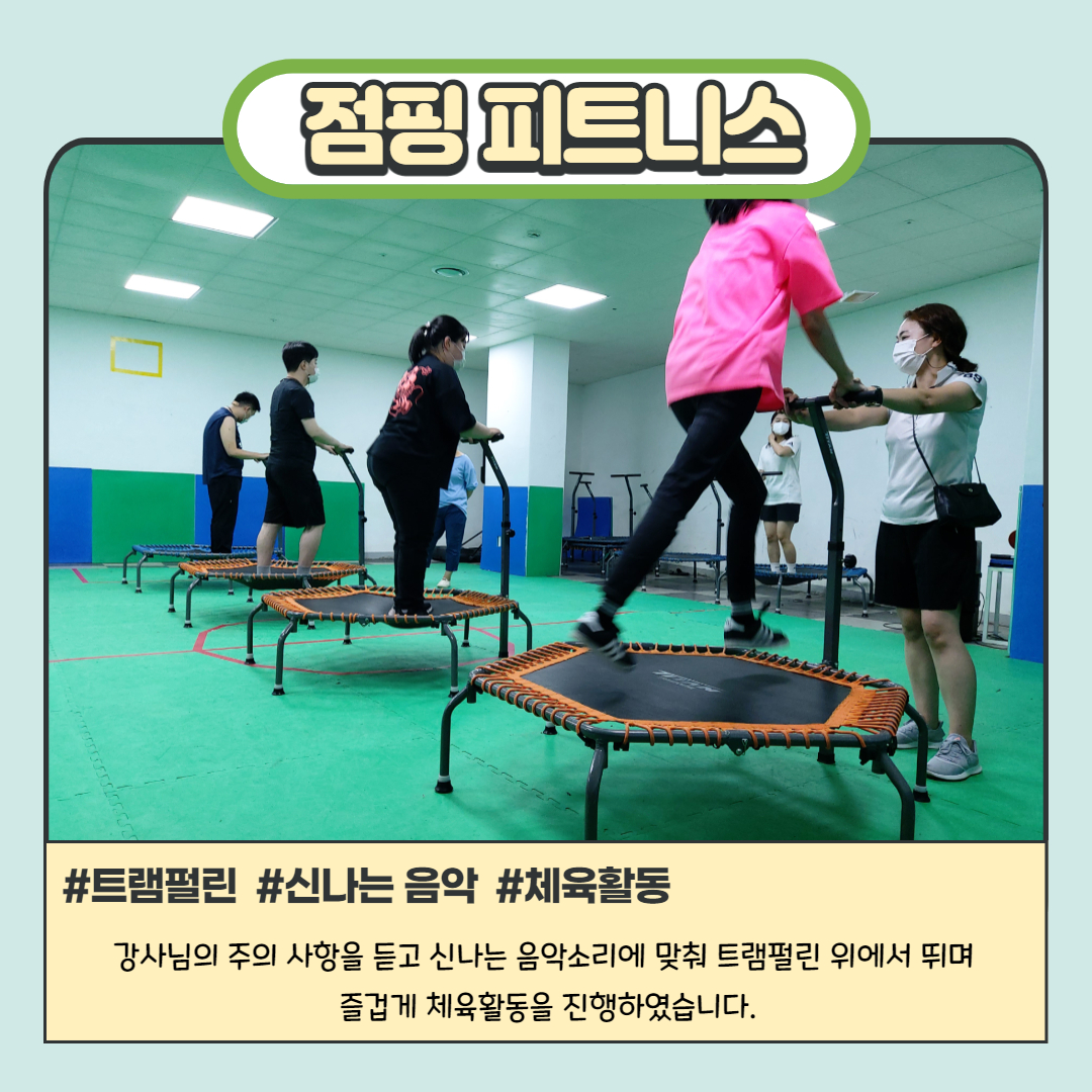 신나는 음악을 들으면서 트램펄린 위에서 뛰며 하는 체육활동으로