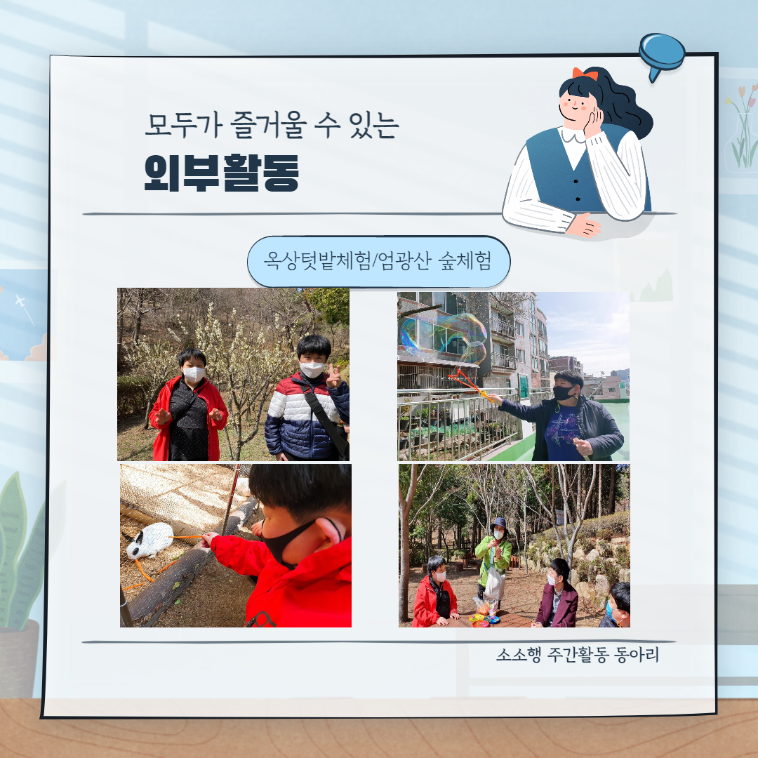 이용자분들이 함께 즐길 수 있는 외부활동인 숲체험과 옥상에서 즐길 수 있는 비눗방울놀이 등을 진행하여보았습니다!