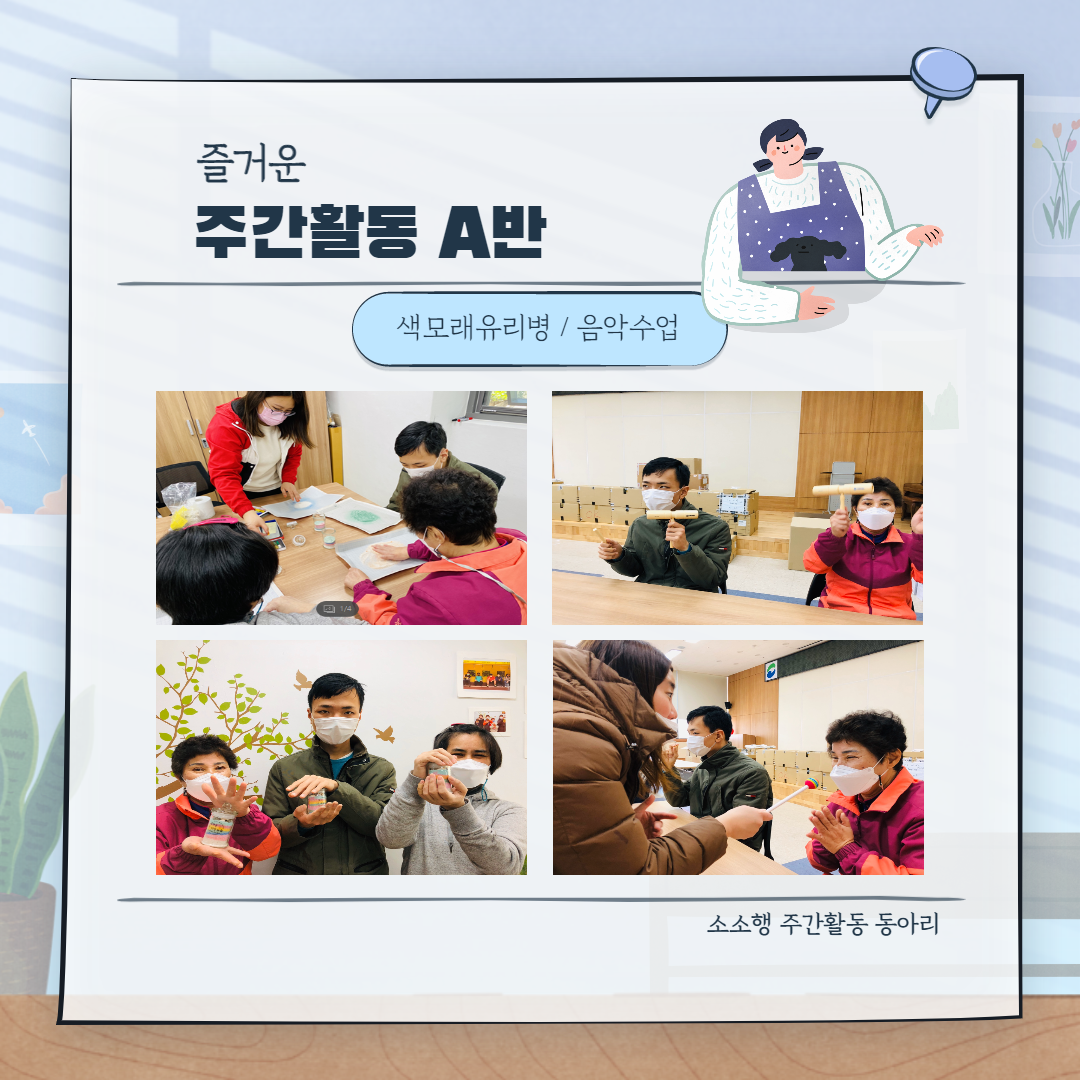 한주 동안 모두 잘 지내셨나요?! 한주 동안 우리 주간활동반은 이용자분들이 즐겁고 알차게 보낼 수 있는 활동을 진행하여보았는데요!