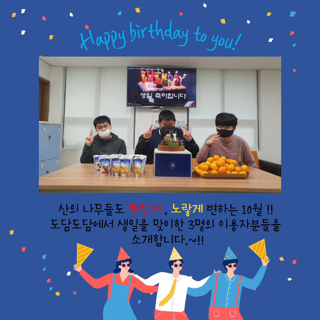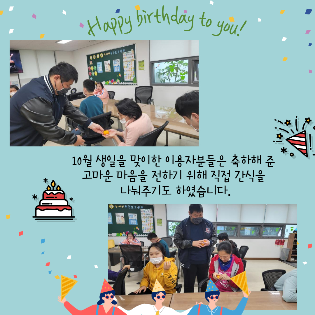 10월 생일인 이용자분들의 생일을 축하하기 위해 생일파티를 진행하였습니다.