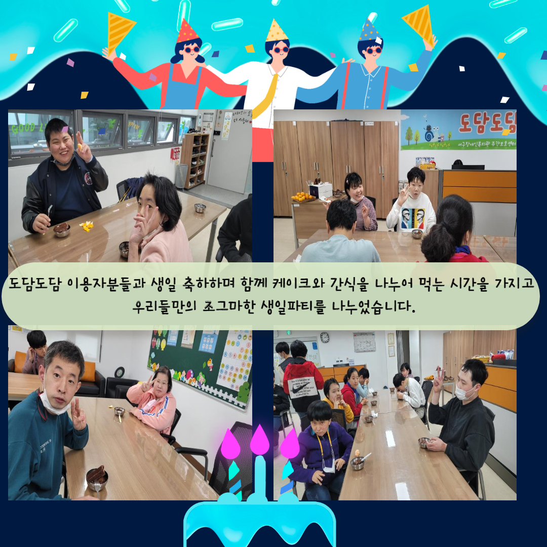 흥겹게 노래도 부르며 간식과 케이크를 나누어 먹으며 즐겁고 행복한 시간을 보내었습니다.