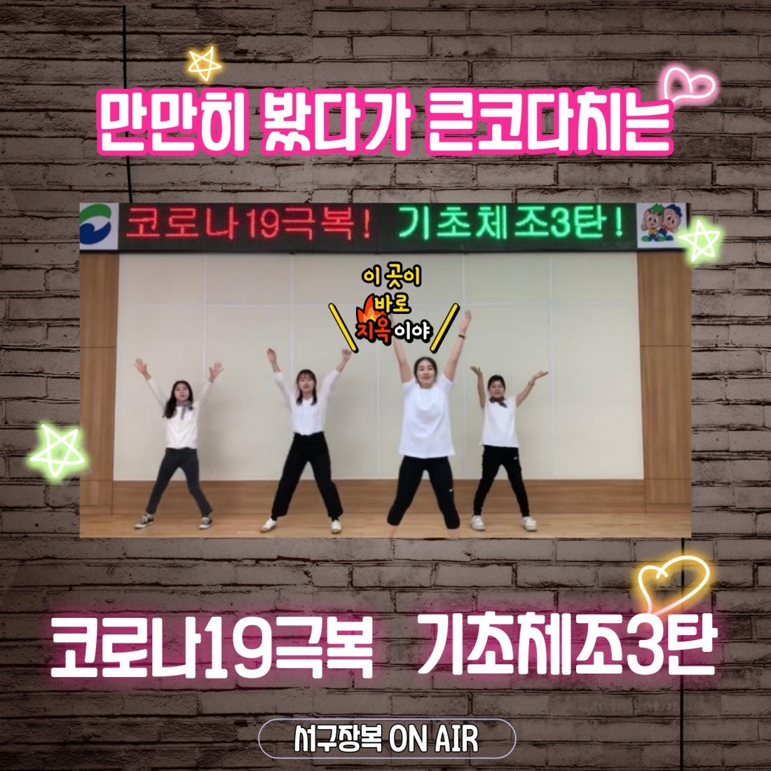 코로나19극복 기초체조 영상 1탄을 준비 하던게 엊그제 같은데 벌써 마.지.막. 기초체조 3탄이 되었습니다ㅠ^ㅠ