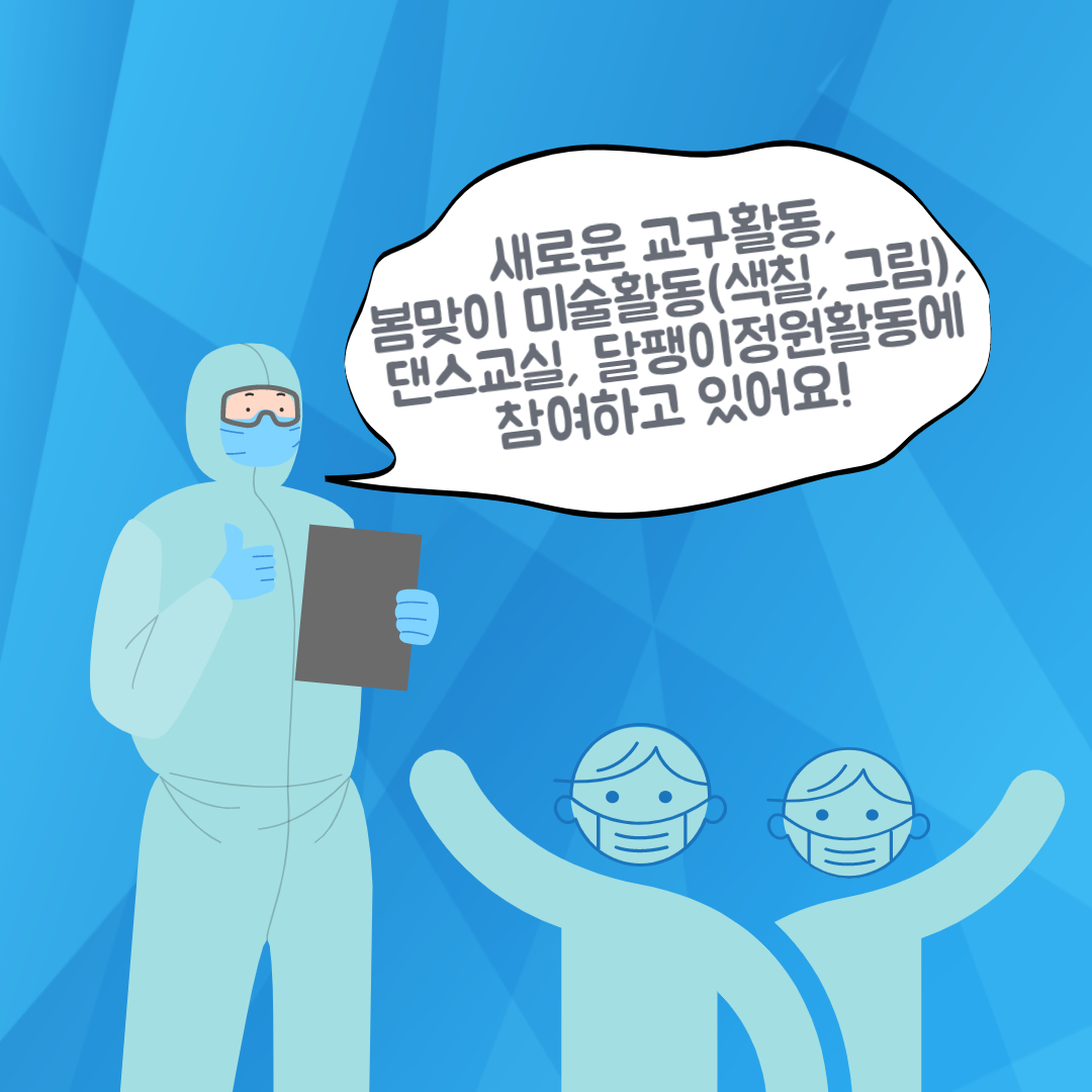 등원 후 발열체크 및 손 소속 등 위생관리는 항상 철저하게 진행하며, 마스크 착용을 생활화 중입니다.